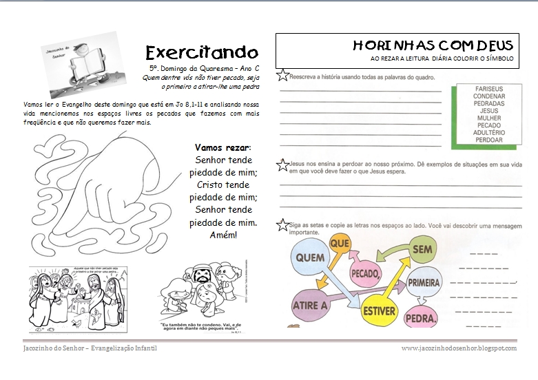 Desculpe a demora em postar a atividade desta semana, mas com a proximidade da Semana Santa, o tempo vai encurtando pra deixar tudo pronto. Inclusive tive que ver na net algumas atividades. Vi em sites de amigos do Catequistas Unidos, eles irão reconhecer seus visuais na atividade e desde já quero agradecer. Os blogs são da Tia Paula, Amiguinhos de Jesus e da Catequista Lucimere. Obrigada!